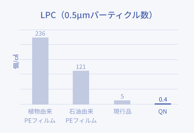 試験項目 試験法 単位 QN 厚さ - μm 70 引張強さ JIS Z 1702 MPa MD 30 TD 20 伸び JIS Z 1702 % MD 279 TD 678 引裂強さ JIS K 7128-3 N/mm MD 130 TD 63 LPC ※四国化工法 個/cm2(0.5μm) 内面 0.4 バイオマス度 - - - 約65% ※ この値は、代表値であり保証値ではありません。