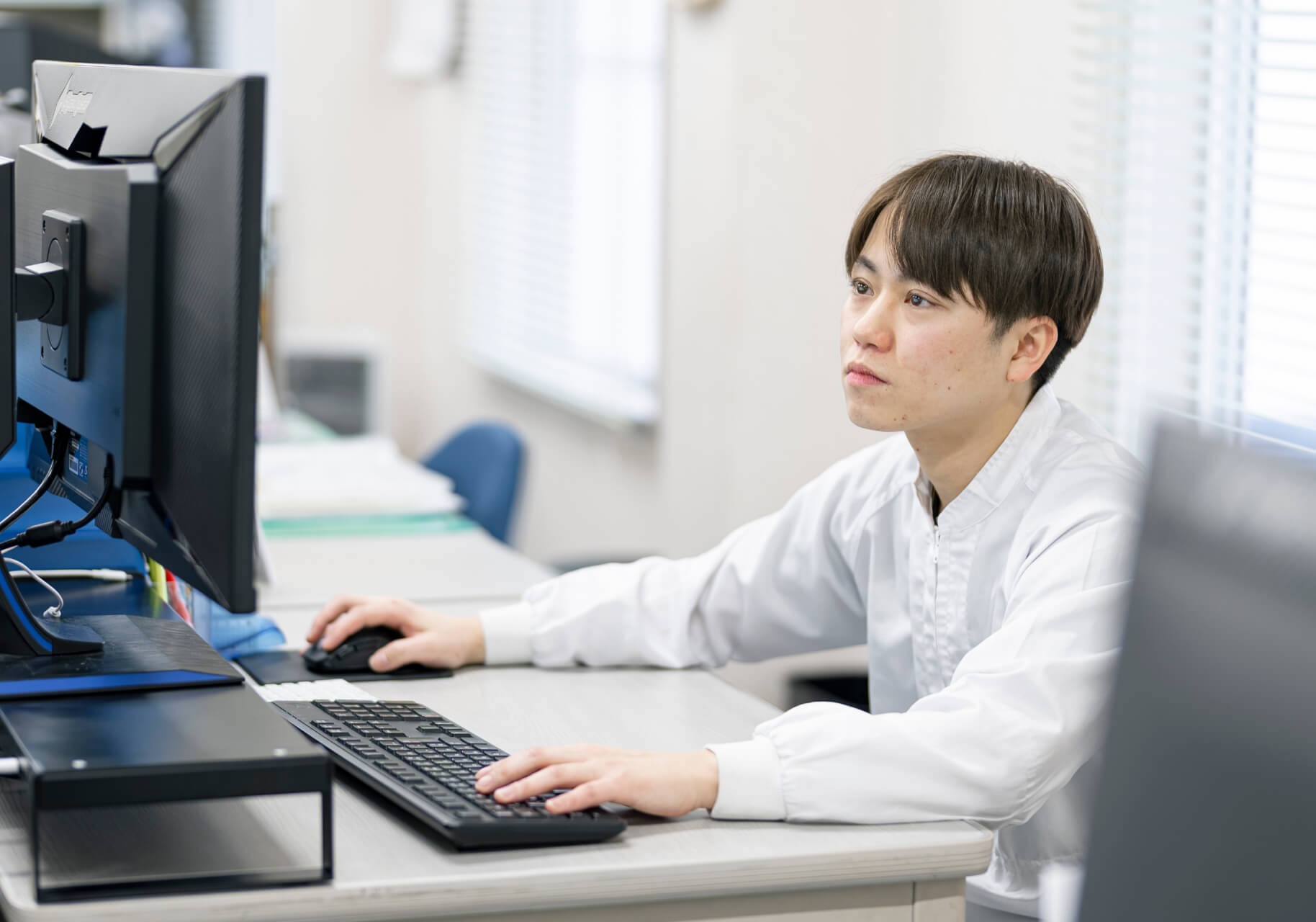 四国化工の生産管理部署は、生産業務の効率化を図り、生産性向上・コスト削減に取り組む、ものづくりの要となる部門です。生産管理システムを有効活用し、営業からの受注に基づき、状況に応じた生産計画を立案します。原材料の在庫管理から、製品の入出庫業務、そして製造の工程管理に至るまで、サプライチェーン全体を見渡すことで、お客様の希望納期に合わせた確実な納品を実現しています。この部門は、製造プロセス全体を最適化するコントロールタワーとしての役割を担っています。